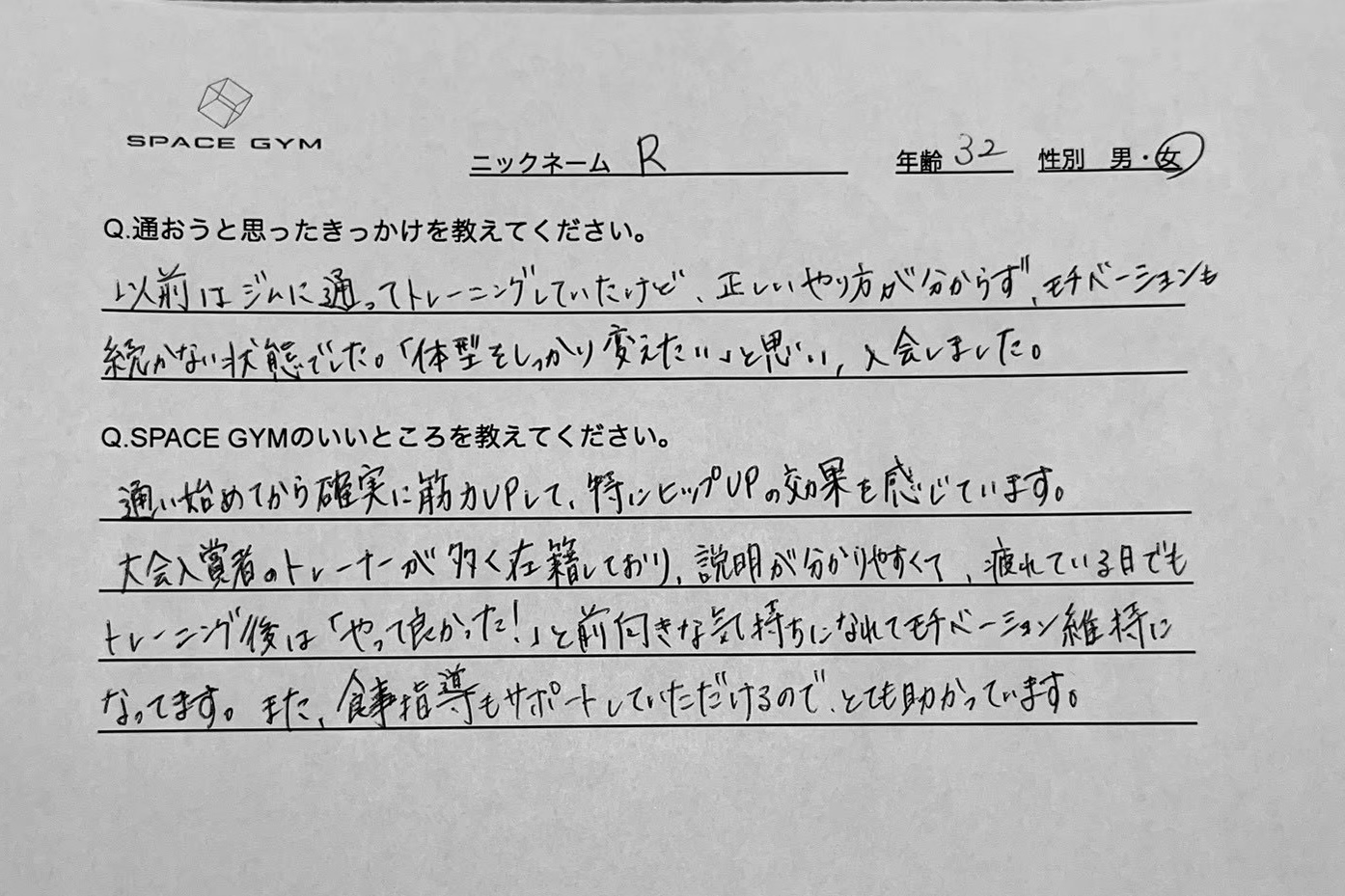 通い始めてから確実に筋力UPして、特にヒップUPの効果を感じています。大会入賞者のトレーナーが多く在籍しており、説明が分かりやすくて、疲れている日でもトレーニング後は「やって良かった」と前付きな気持ちになれてモチベーション維持になってます。また、食事指導もサポートしでいただけるので、とても助かっています。